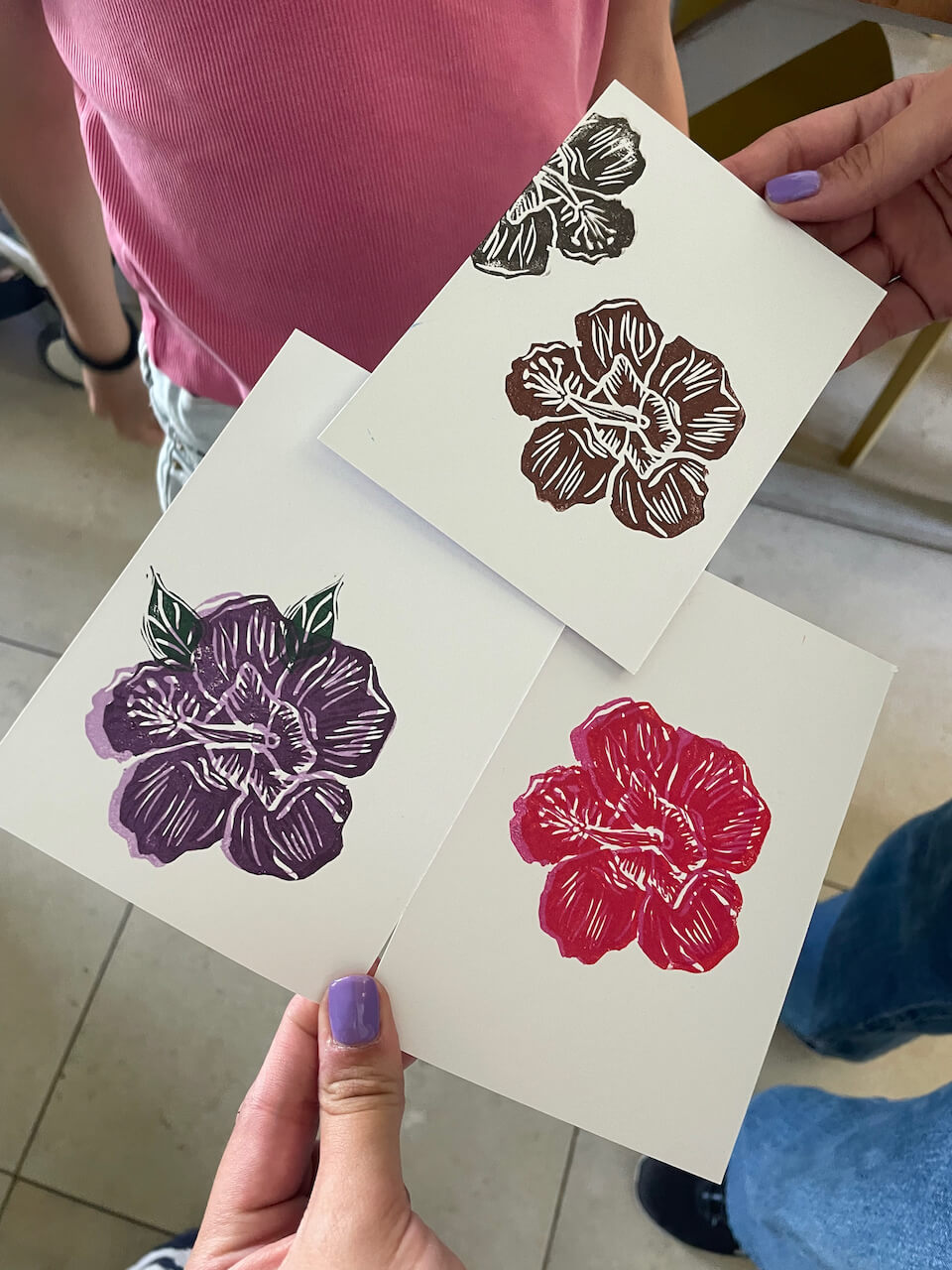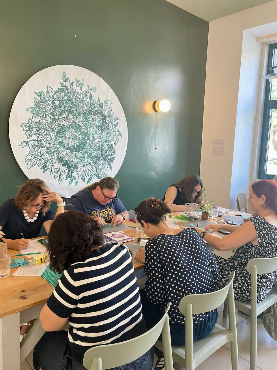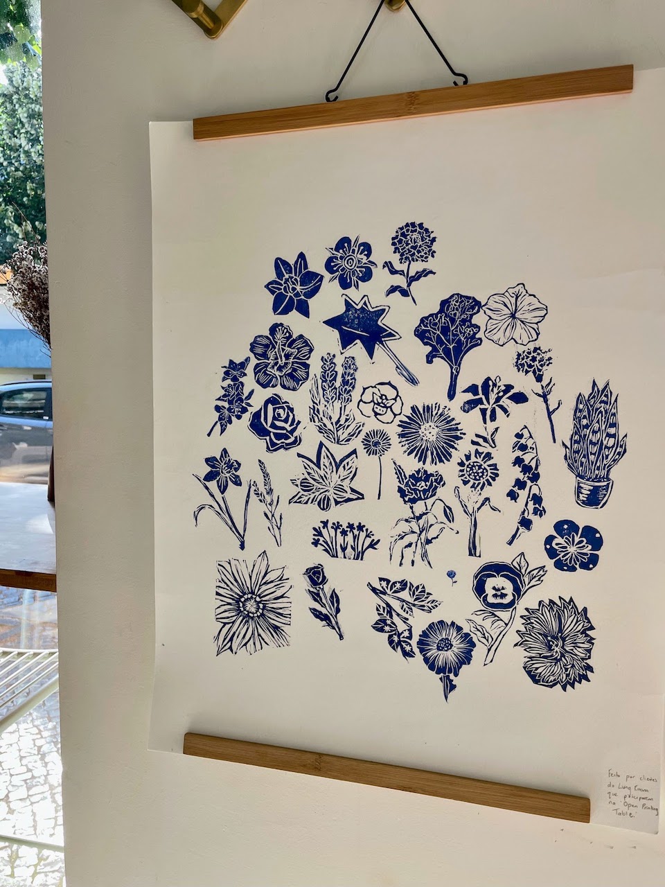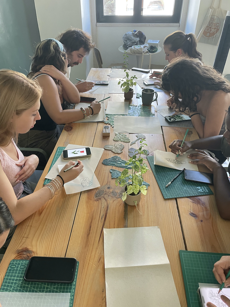 Over two mornings in July people were invited to take part in an open printmaking event where they discussed and created plants or flowers of significance to them in response to the exhibition ‘Montra em Execução´ at The Living Room in Coimbra.